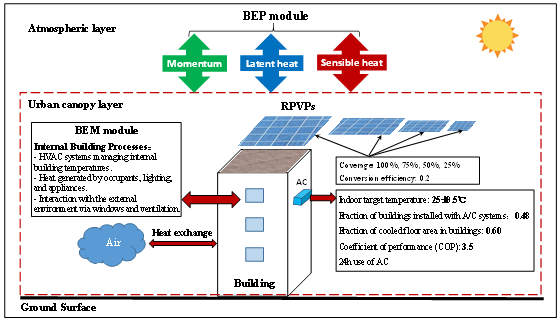 在WRF/BEP+BEM模型中用于太陽能板屋頂模擬的城市網格單元示意圖