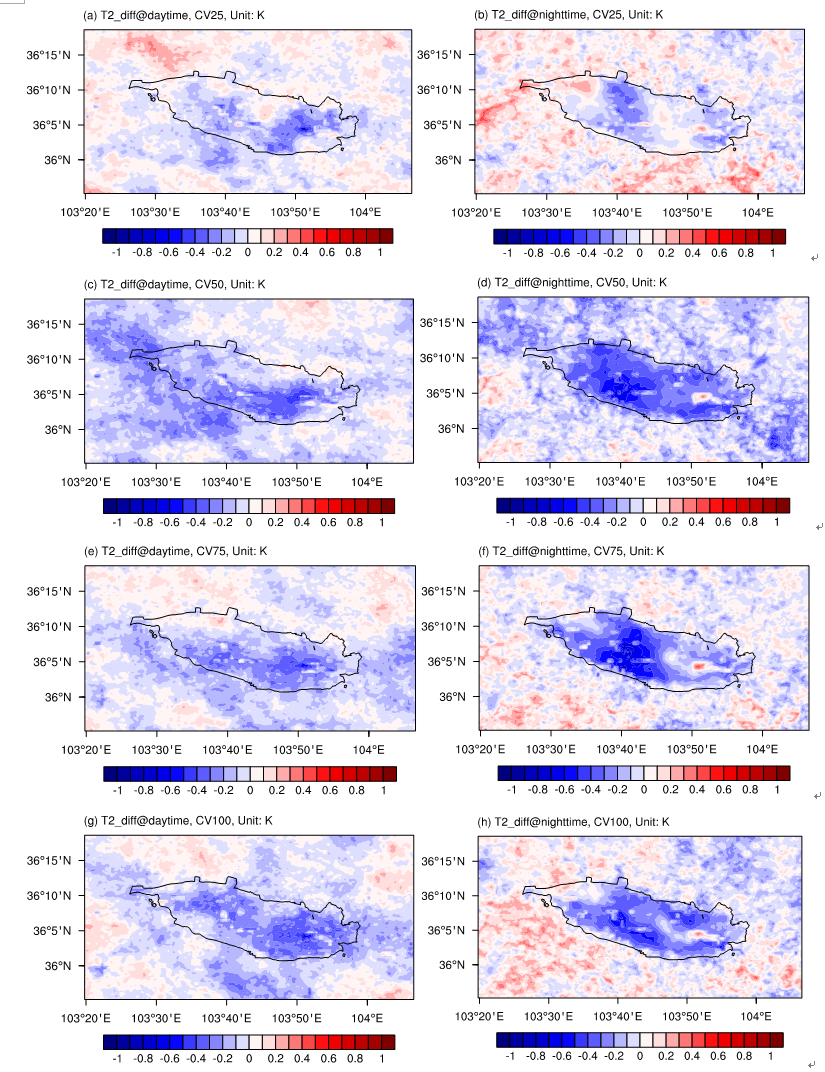 中國科學院西北生態(tài)環(huán)境資源研究院高曉清研究員團隊聚焦我國典型復雜地形城市——蘭州,在熱浪事件背景下,利用國際先進的中尺度氣象模型(WRF)并耦合城市建筑效應參數(shù)化與建筑能耗模型(BEP+BEM),精細模擬了不同覆蓋率(25%、50%、75%、100%)下的屋頂光伏對城市熱環(huán)境的多維度影響。