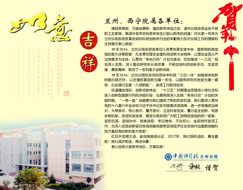 律回春暉漸,萬(wàn)象始更新。值此新年來(lái)臨之際,謹(jǐn)向分院系統(tǒng)全體干部職工及家屬、離退休老同志和青年學(xué)生們致以新年的祝福!對(duì)大家一年來(lái)為蘭州分院系統(tǒng)改革發(fā)展和科技創(chuàng)新所付出的辛勤努力及對(duì)分院工作的理解和支持表示衷心感謝!